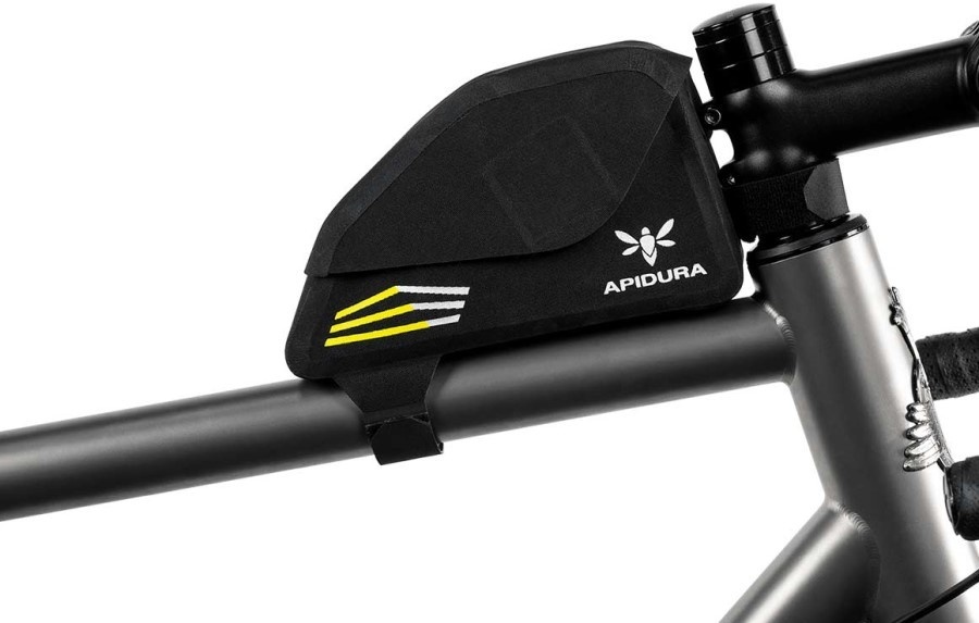 This waterproof top tube bag, constructed from an ultralight laminate developed for Apidura, fastens securely to the top tube and works alongside a wide range of frame bags. The completely waterproof flip-top opening provides fast access and a clear view of the full contents of the bag, while keeping your belongings dry.